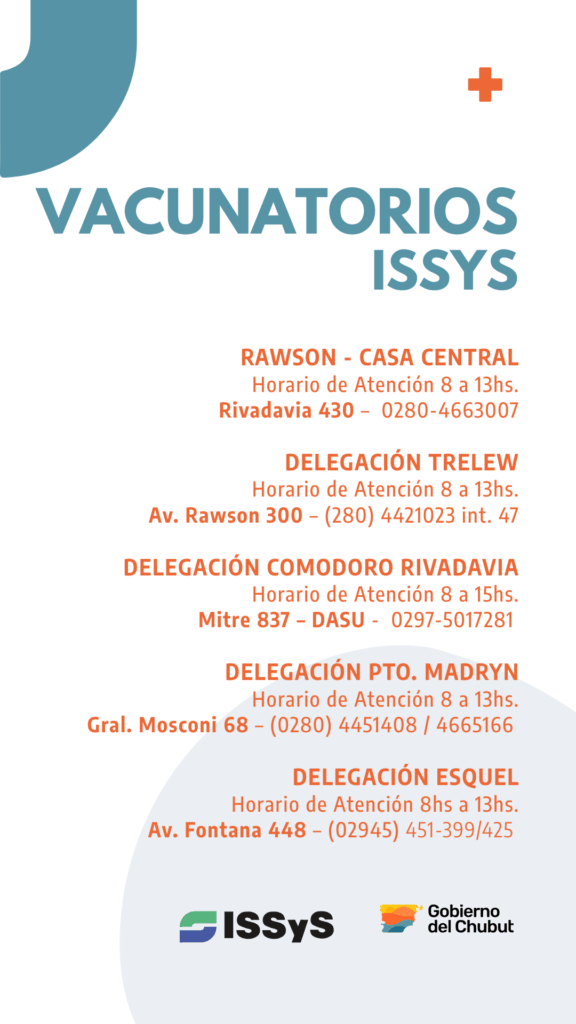 El Instituto de Seguridad Social y Seguros del Chubut (ISSyS), a través de su obra social SEROS, recuerda a sus afiliadas y afiliados la importancia de completar los esquemas de vacunación y acercarse a los vacunatorios habilitados en las distintas delegaciones del organismo.